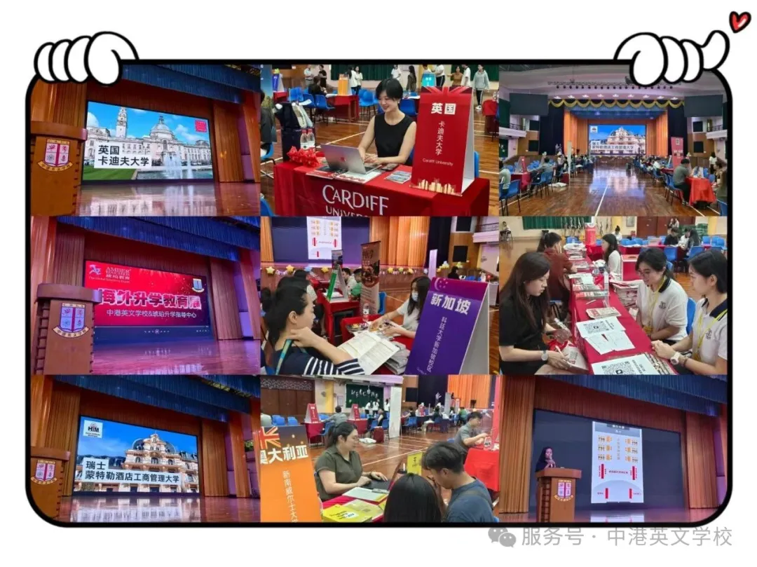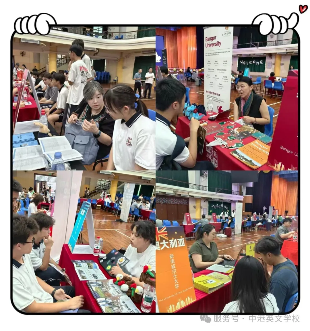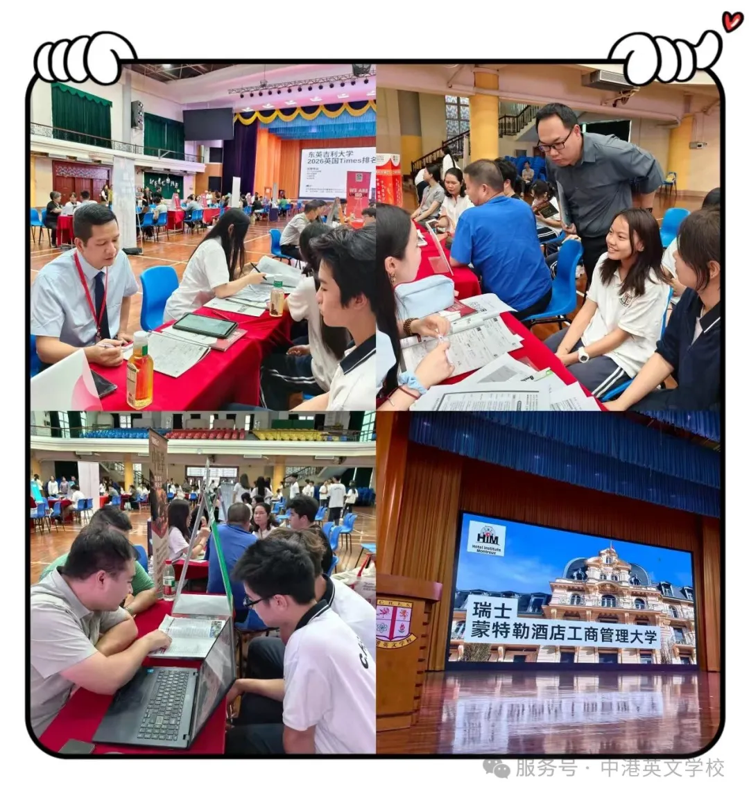 近日,中港英文学校海外升学教育展在学校礼堂圆满举行。来自英国、美国、瑞士、澳洲、马来西亚、新加坡、法国等多个国家的院校齐聚一堂,为学生及家长带来丰富、专业的升学资讯。本次活动不仅加深了同学们对海外留学前景的认识,也进一步促进了家校之间的沟通协作,帮助学生与家长更清晰地规划未来的学习与升学路径。