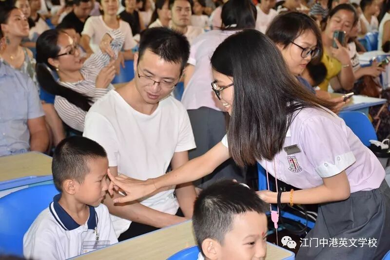 体验国学之礼,放飞远大梦想击鼓明智,寓意让孩子目明耳聪、茅塞顿开。 启蒙描红,一撇一捺间教会孩子顶天立地做人。 新学期伊始,中港英文学校一年级新生举行了寓意深远的开笔礼来作为步入小学生活的第一课。 “开笔礼”这一传承已久的启蒙仪式,也让孩子们深刻感受到了中华5000年文明的魅力。 那么让我们一起走进活动,去领略现场那些震撼人心的场面。 端 正 衣 冠 古人云:冠必正,纽必结,衣贵洁,不贵华。也就是说,头上的帽子要戴端正,衣服的纽扣要扣牢,身上的衣服不在于有多么漂亮,而是要干净整洁。 朱 砂 启 智 孩子的额头正中点上红痣,这个“痣”又通智慧的智,意为开启智慧,以此寄托美好的意愿,一颗颗红痣饱含着父母、长辈、学校的美好祝愿。 击 鼓 鸣 志 “鸣”通“明”,“鸣志”就是表明自己的志向,意为击鼓的声音越响,声音传得越远,说明志向就越远大。 启蒙描红 “人生聪明识字始”,写字识字是学习文化的第一步,描红笔画简单而意义深远。而“人”字,寓意着在人生的启蒙阶段,学会做人是最为重要的。